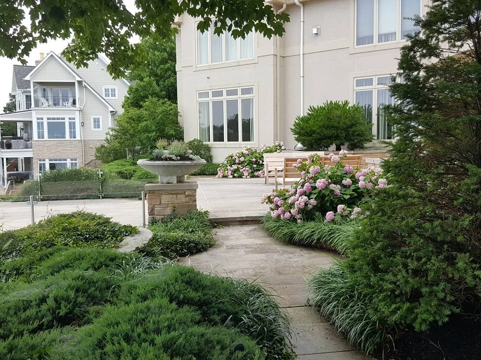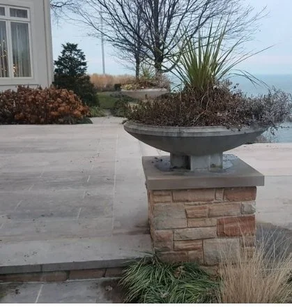 An intimate lakeside courtyard overlooking Lake Erie designed for quiet evenings - blending natural textures, lush plantings, soft lighting and timeless charm.